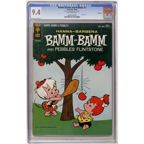 <B>Bamm-Bamm and Pebbles Flintstone #1 File Copy (Gold Key, 1964) CGC NM 9.4 Off-white pages.</B></I> Only issue of this title. Overstreet 2007 NM- 9.2 value = $140. CGC census 10/07: 6 in 9.4, 1 higher.<BR><BR><b>Shipping:</b> Comics - Slabbed (certified) (<a target="_blank" href="http://www.heritageauctions.com/common/shipping.php">view shipping information</a>)
