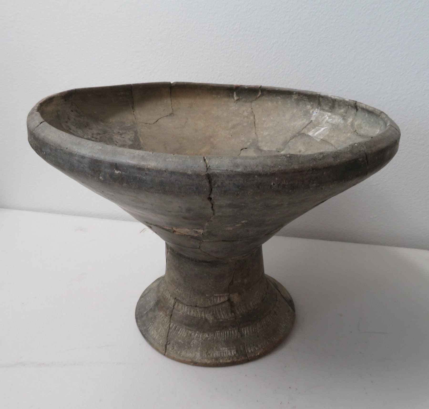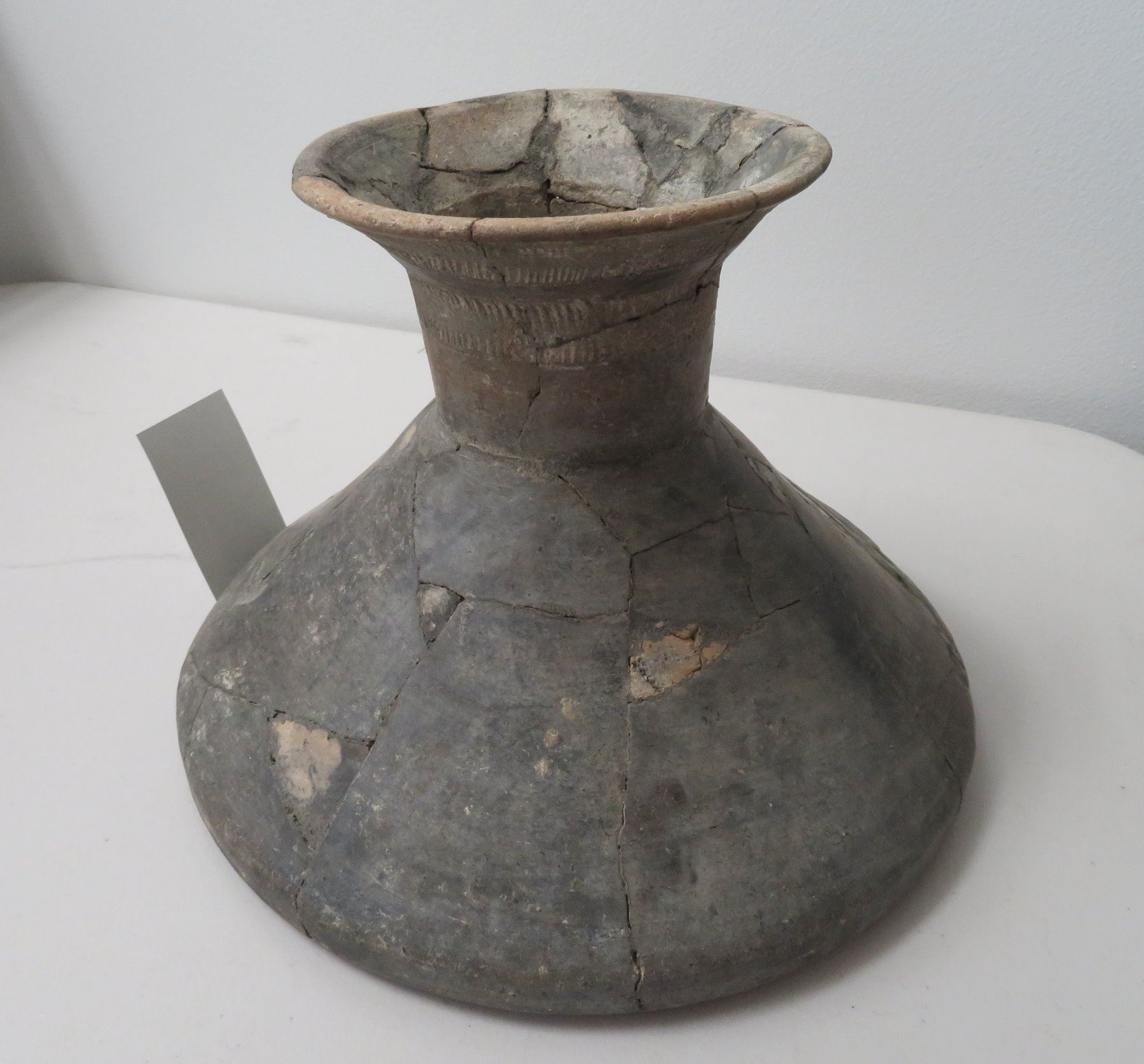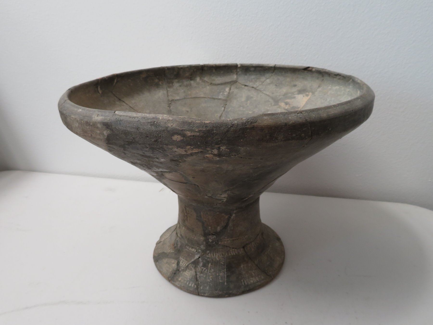 Ban Chang Pot, pre-historic item. Made of clay, the item measures 11" x 8". Southern China. Condition: Broken and reassembled, see images. Shipping: $50.00 USA estimate only, due to size and weight, w/insurance and signature, double-boxed.