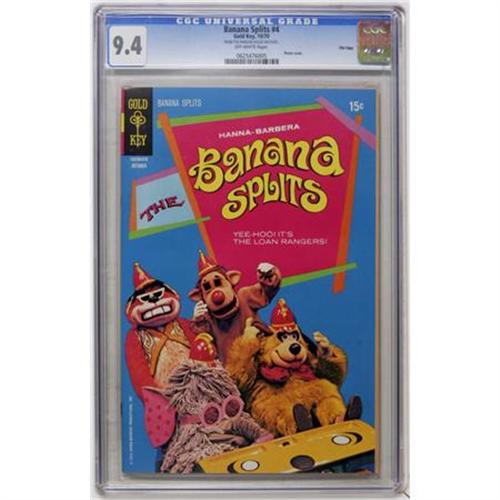 <B>Banana Splits #4 File Copy (Gold Key, 1970) CGC NM 9.4 Off-white pages.</B></I> Photo cover. CGC notes, "From the Random House Archives." Overstreet 2007 NM- 9.2 value = $110. CGC census 9/07: 6 in 9.4, none higher.<BR><BR><b>Shipping:</b> Comics - Slabbed (certified) (<a target="_blank" href="http://www.heritageauctions.com/common/shipping.php">view shipping information</a>)