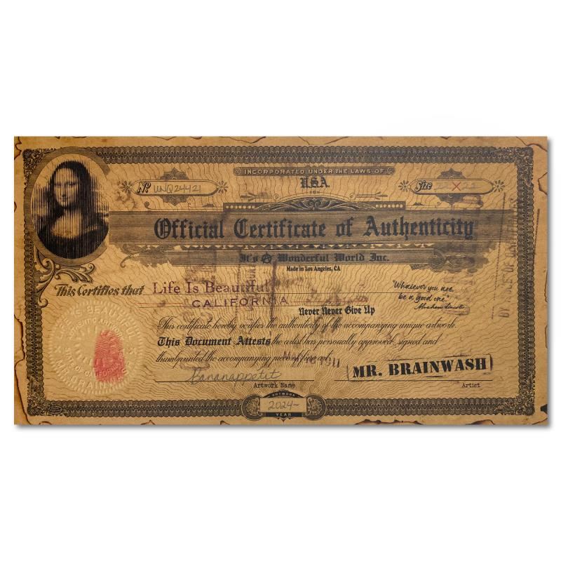 "Bananappetit" is a unique (UNIQ) mixed media on deckle edge paper by Mr. Brainwash, hand signed and bearing the thumbprint of the artist inverso. This piece comes custom framed. Includes Certificate of Authenticity. Measures approx. 26" x 26" (frame), 22" x 22" (image).