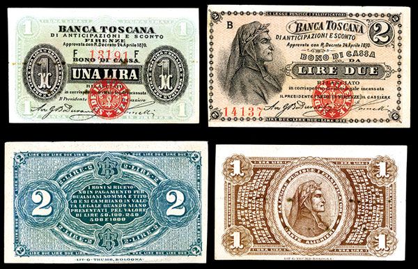 Italy, pair of issued 1 and 2 Lire scrip notes, both appear to be in UNC condition. Unusual.