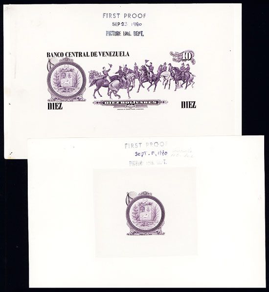 Venezuela, 1980, Lot of 3 pieces. Includes 10 Bolivares, P-57, Unlisted Progress Proof Issue, Proof of complete back officers on horseback center right, printed in purple without background engraved on the plate, only the horses with officers and title. Printed on india paper on large white card. Top margin has ÒFIRST PROOF - Sep 23 1980 - Picture Engraving Dept.Ó, also included is a large die proof of Venezuela Arms located on the left side of the note with similar text on top of proof. A photo of the model is also included. Uncirculated. ABNC. Rare if not unique Venezuela banknote production material. ABNC.