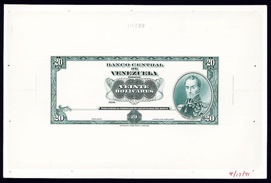 Venezuela, 1980, 20 Bolivares, P-52 Unlisted Progress, Proof of partially engraved face printed on india paper on large card. Complete border and text but missing under tints and lower engraved signature block areas. complete back with central map, printed in blue. Dated on lower right Ò9/17/71Ó. Printed on india paper on large white card. Plate # 11239. Unique proof found in the archive. Choice to Gem uncirculated. ABNC.