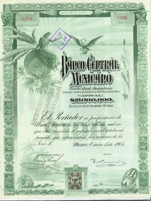 1905, Mexico. Stock certificate. Green/Black. Ornate certificate with vignettes of female figure, eagle and snake, helmut and sword and shield. Very fine.