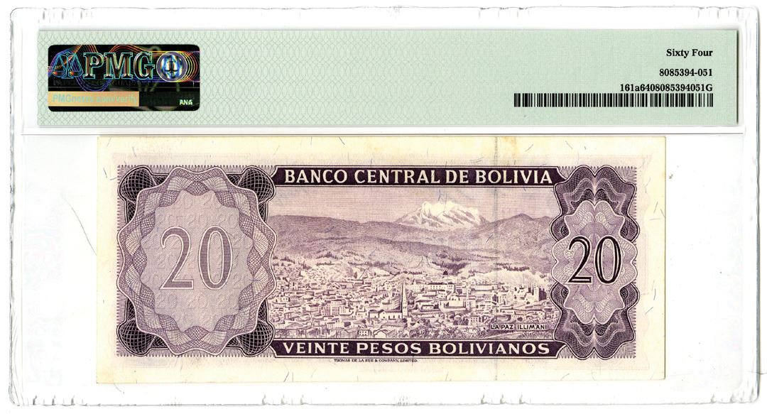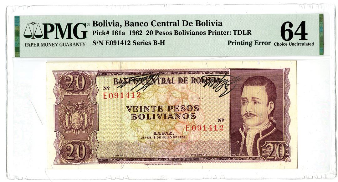 Bolivia. 1962. 20 Pesos Bolivianos, P-161a, Issued banknote, Purple and multicolor, S/N E091412 Series B-H, Printing Error, PMG graded Choice Uncirculated 64. Printer: TDLR.