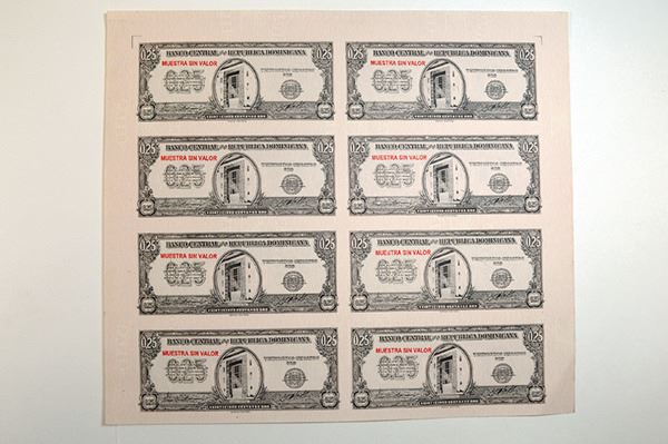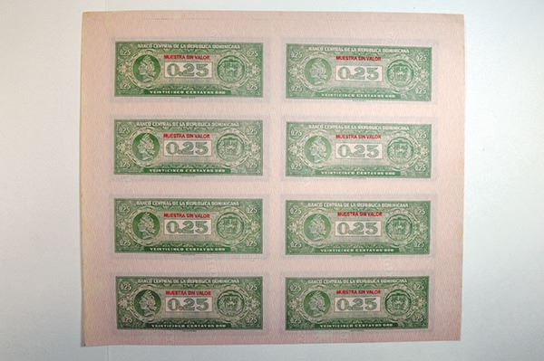 Dominican Republic. 25 Centavos. SCWPM 88 for type, unlisted in this form. Without serial #, overprinted in red on both sides: MUESTRA SIN VALOR. Partial uncut sheet of 8 notes, wide margins. Extremely fine with the slightest paper bend.