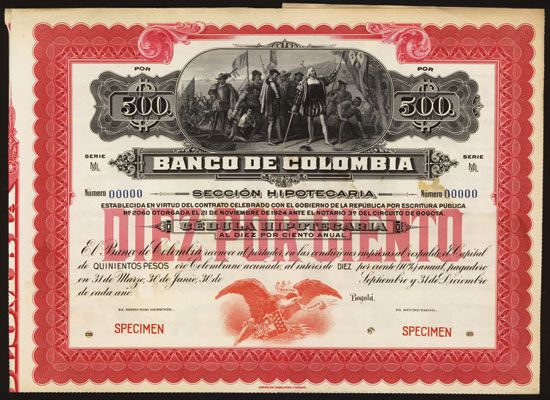 Bogota, Colombia, ND (ca.1919), 1905, 500 Pesos Oro, Series M, Unlisted but Similar to P-S397 with portrait of ÒLanding of ColumbusÓ on top and eagle on bottom, but different denomination, Specimen banknote, Black title, vignette and text with red border and orange eagle on bottom, Unlisted denomination and color in Pick. Red specimen overprint, POC's and Ò00000Ó serial numbers. Coupons attached. Impressive vignette of ÒLanding of ColumbusÓ measuring 4 5/8ths by 2 1/8th inches. Choice XF to AU condition with very light water stain in middle bottom of note that could possibly be improved on. Rare note. ABNC.
