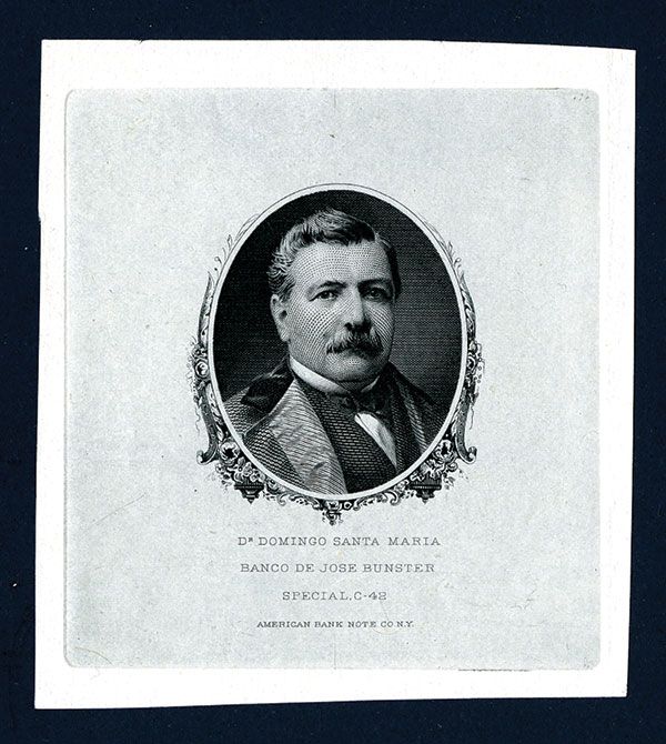Chile, 1882, Proof portrait of Dr. Domingo Santa Maria that was used on the 1 Pesos, P-S131 and 5 Pesos, P-S132, both only known as proof and not issued. Black on india paper with light gray underprint, CU condition. Rare security printing collateral. ABNC.