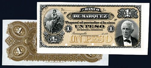 Barranquilla, Colombia, 1880's, 1 Peso, P-S581p, Front and back proofs, the front is black on tan underprint on india on cut down card, the back is brown printed on india only, The face has POC's and appears Choice to Gem Uncirculated, the back would grade choice but there is a small internal tear 1.5mm on the right excess border that keeps it from Gem Uncirculated, Attractive and rare in any format, ABNC.