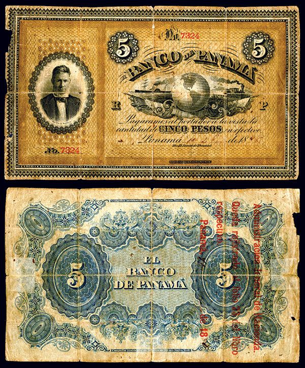 Panama, Colombia, 18xx (ca.1869) 5 Pesos, P-S722, Issued banknote, black on brown underprint, Red vertical overprint on right back, Portrait A. Planas on left, globe with locomotive and steamship on right, S/N 7324, Choice VG to VG + condition with heavy folds and small reinforced splits at margins where folds occur, Scarce and attractive Panama predecessor rare note in any condition, ABNC.
