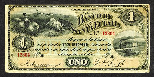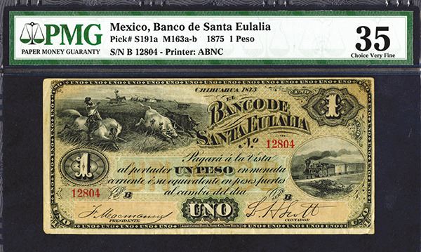 Chihuahua, Mexico, 1875, 1 Pesos, Ser.B, P-S191a, BK-CHI-18.5, M163a-b, Issued banknote, Black on light orange and blue undertint, Gaucho roping steers upper left, locomotive on lower right, back light brown, Red serial number 12804, PMG graded Choice VF condition 35, attractive colors and large margins, ABNC.