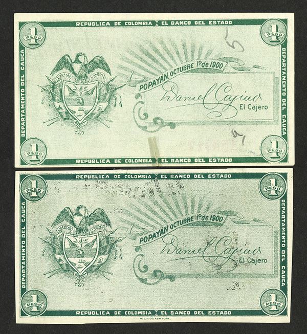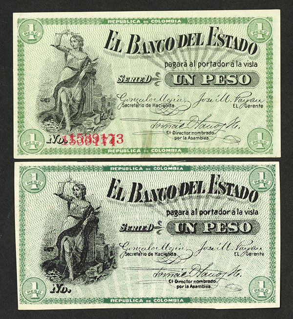 Colombia. 1 Peso, P-S504c and S504r. The serial number is doubled but sequential 1539173 with overprint of sequential serial number 1539174. AU with a repaired 4 mm tear bottom middle, P-S504r looks like it is over inked and is a possible error. AU.
