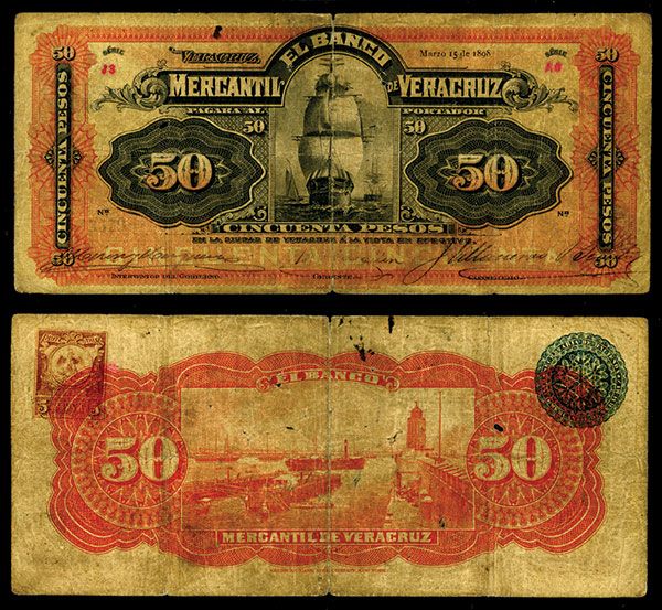 Veracruz, Mexico. March 15, 1898. 50 Pesos, Serie J3-A6, P-S441a (M532a), Issued banknote, Sailing ship straight on, black with orange border, PMG graded Choice Fine 15 NET with note of splits there are 8 or 9 small holes and one worm hole on the note, Rare note in any condition, ABNC. This is the only note graded in the PMG census of this denomination.