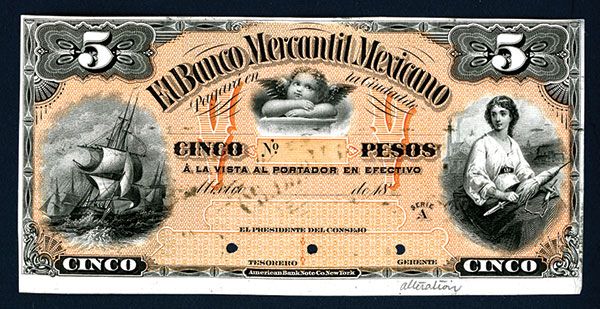 Mexico. 1882. Series A. P-S243p. 5 Pesos. Obverse proof printed on India paper. Choice UNC. Very rare note. ABNC.