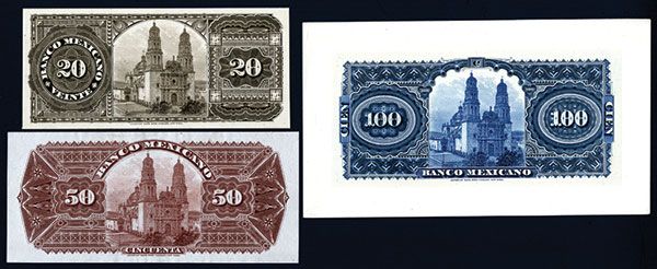Mexico. Chihuahua. 1888. Trio of three back proofs, includes 20 Pesos, P-S157p; 50 Pesos, P-S158p; and P-S159p, 100 Pesos. The 20 and 100 are mounted on card stock. All three pieces feature church at center and denomination at both sides. Rare and UNC. ABNC.