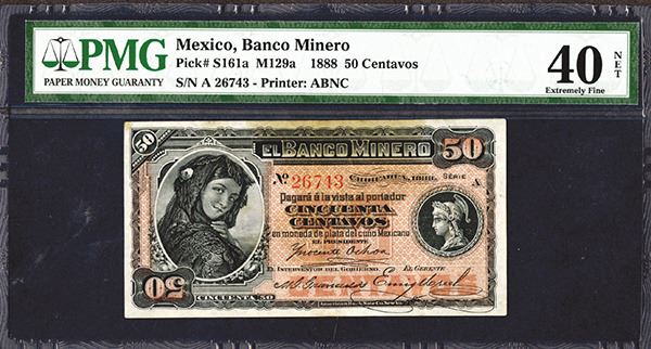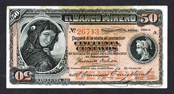 Chihuahua, Mexico. 1888, 50 Centavos, Series A, P-S161a, BK-CHI-67, M129a, Issued Banknote, face is black on light red-pink underprint with allegorical young woman on left and cameo Greek or Roman bust on right, back is brown with seated tropical allegorical woman with palm trees. PMG graded Extremely Fine 40 NET with toning or a light stain on the top middle margin, large margins, S/N 26743, ABNC. Very attractive and scarce banknote issued.