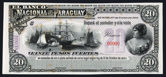 Asuncion, Paraguay, January 1, 1886, 20 Pesos Fuertes, P-S149, Unlisted Face proof, no back, printed in black on lilac underprint on india on thin card cut down to banknote size, woman on right with harbor scene at middle and left, CU condition with a few light toning spots that keeps this lovely note from Gem, extremely rare note in any form and unpriced in SCWPM. Rarely seen at auction. ABNC.