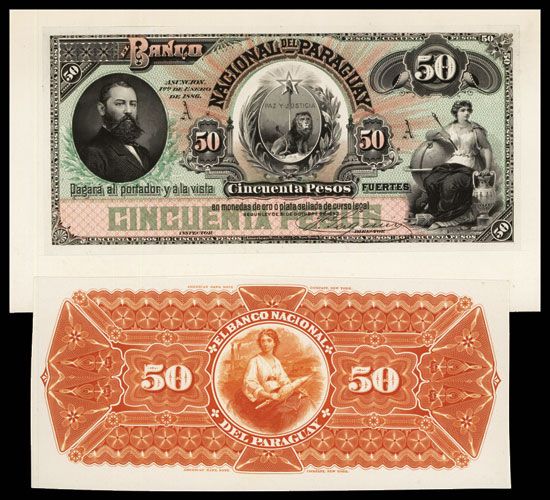 Asuncion, Paraguay, January 1, 1886, 50 Pesos Fuertes, P-S150, Unlisted Face and back proofs, printed in black on green and red underprint on india on thin large card for the front and cut down to banknote size for the back, the back is orange-red, allegorical seated woman with globe and urn on right, Paraguay arms at center and man at left, Uncirculated to CU+ condition, extremely rare note in any form and unpriced in SCWPM. Rarely seen at auction. ABNC.