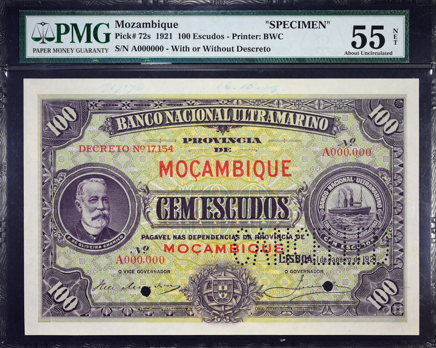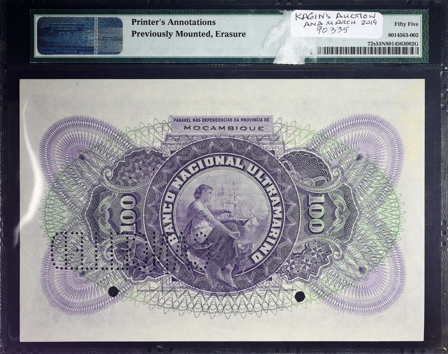 Specimen overprints, serial numbers, perforations and punch cancels. Always a popular large-format design and this piece shows with the red Mocambique overprints. Lovely color and detail with the mounting remnants being faint and the erasure occurring at the printer's annotations at top.