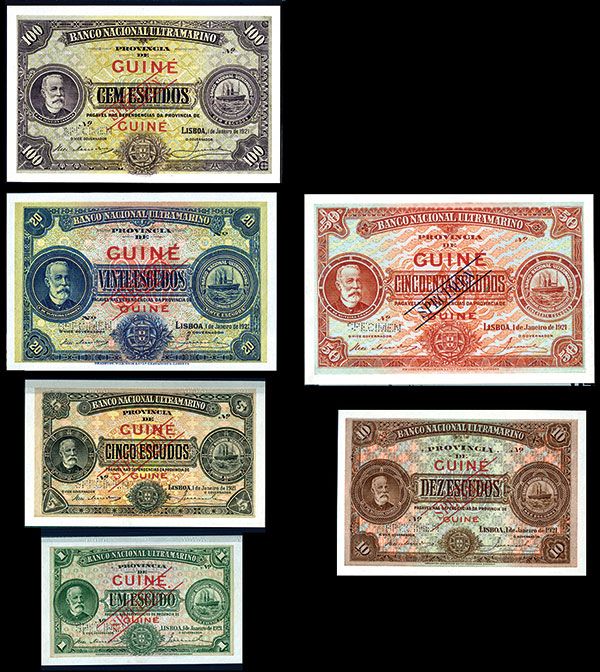 Portuguese Guinea, 1921, Lot of 6 different Specimen notes, all PMG graded, All with Chamico on left with ship on right, Includes 1 Escudos, P-12s to 100 Escudos, P-18s; all but the 5 Escudos are the finest graded in the PMG census with only 3 examples of each graded except for the 100 Escudos which is the only one graded. The 1 and 5 Escudos grade Unc. 62 and Choice AU 58, the 10 through 100 Escudos are graded between CU 63 or 64 with a note on the 100 that it was lightly previously mounted, Rare high grade banknote group. BWC.