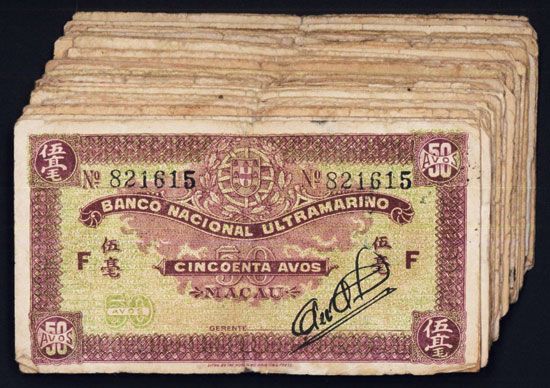 Macau, ND (1944), Lot of 37 banknotes, all are 50 Avos, P-21 issued banknotes, purple on light green with various shade variations, back orange, almost every series letter between A to J are represented except for 2 letters, condition varies from VG with minor edge tears and problems to Fine+. Litho by Hong Kong Printing Press.