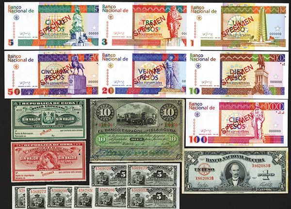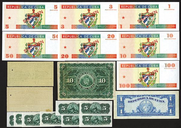 Cuba. 1, 3, 5, 10, 20, 50, 100 Pesos Convertibles. 1994. All specimens, Choice Uncirculated. Banco Espanol de la Isla de Cuba, 5 Centavos small sized notes SCWPM 45a (8), Uncirculated, 10 Pesos, 1896. SCWPM 49a. Very Fine+; Special import or consumption stamps, Banco Nacional de Cuba 1 Pesos. Tape residue at right edge. 19 pieces.