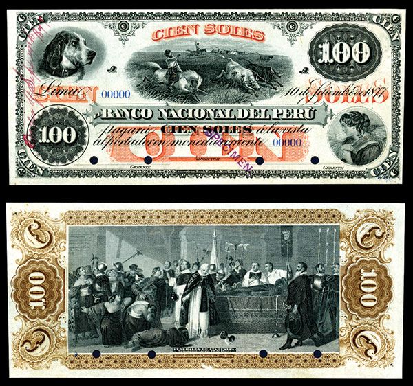 Peru, 100 Soles, P-S317 Unlisted Specimen as well as being the base note for the 1877 Provisional Issue without the overprint that is found on the issued examples, black on orange underprint with dog on upper left, young woman with grain on lower right with men lassoing cattle in the middle which is usually obliterated in the issued notes by the overprint, back with ornate vignette in black of "Funerales De Atahualpa" surrounded by brown border, Purple Specimen overprints and POC's, Choice Uncirculated with 5 small pin holes on the left margin and another one on the top right corner as well as a very small thin on the bottom middle brown border that is barely visible, Unpriced in SCWPM, rare and a trophy for the Peru collector.
