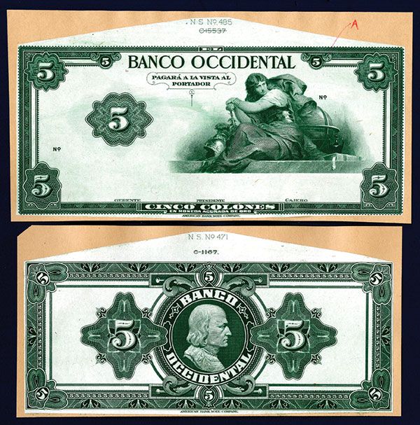 El Salvador, pair of obverse and reverse proofs mounted on card stock, both for the 5 Colones, P-S195p note. ABNC. UNC and striking.