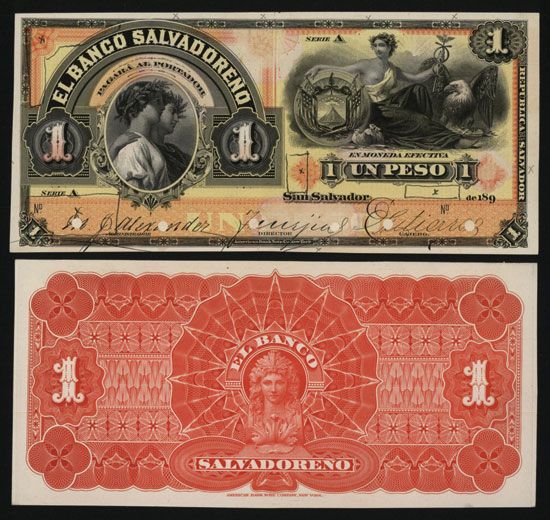 San Salvador, El Salvador, 189x (ca.1899), 1 Peso, Ser. A, P-S201p, Front and back proofs cut down to banknote size, the front used as a model for different chemical test on a variety of areas of the inked paper. The test areas are circled or a small X placed in border to mark the test location. Some areas are faded and others look normal. Interesting and rare ink testing by ABN Counterfeit Research Department. Well known Reapers on left with seated allegorical woman with eagle and El Salvador arms on right. The note would grade Uncirculated except for the test areas which do not stand out. ABNC.