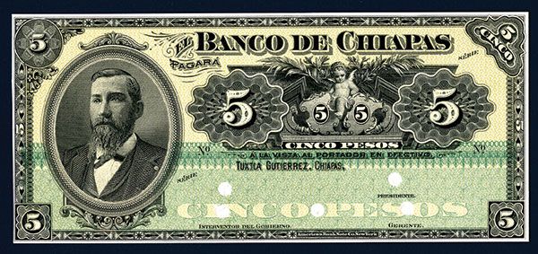 Mexico. 1902. P-S113p. 5 Pesos. Uniface obverse proof on card stock. Black on green and yellow underprint. Rare in any form and choice UNC. ABNC.