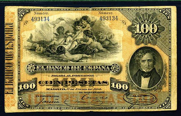 Madrid, Spain, 1884, 100 Pesetas, P-26, Issued, Black on orange underprint, Portrait of Mendizaral on right, Cherubs frolicking on left, back orange, S/N 493134, PMG graded Very Fine 25, Rare and extremely attractive early ABNC Spanish Issue. This is the only graded example in the PMG Census.