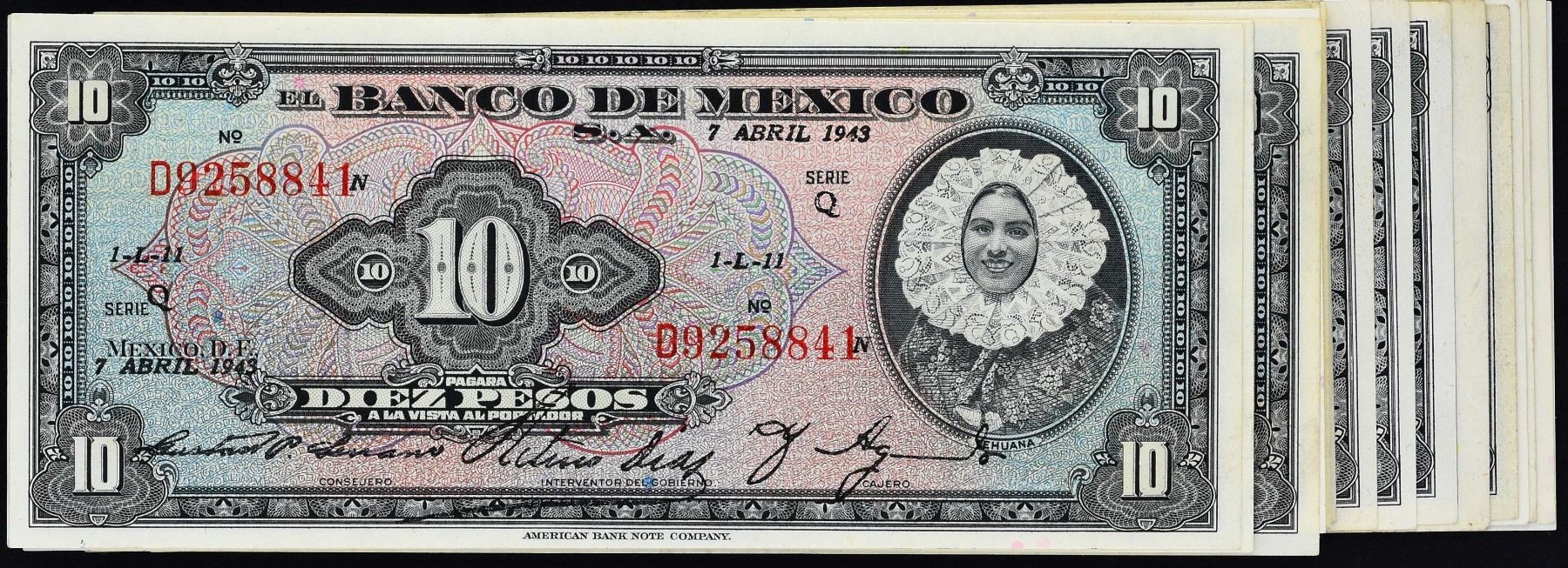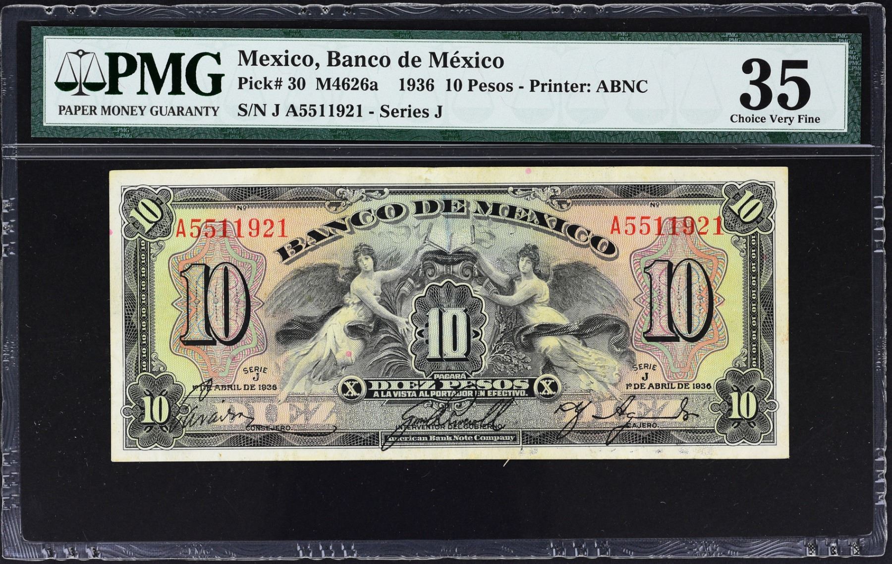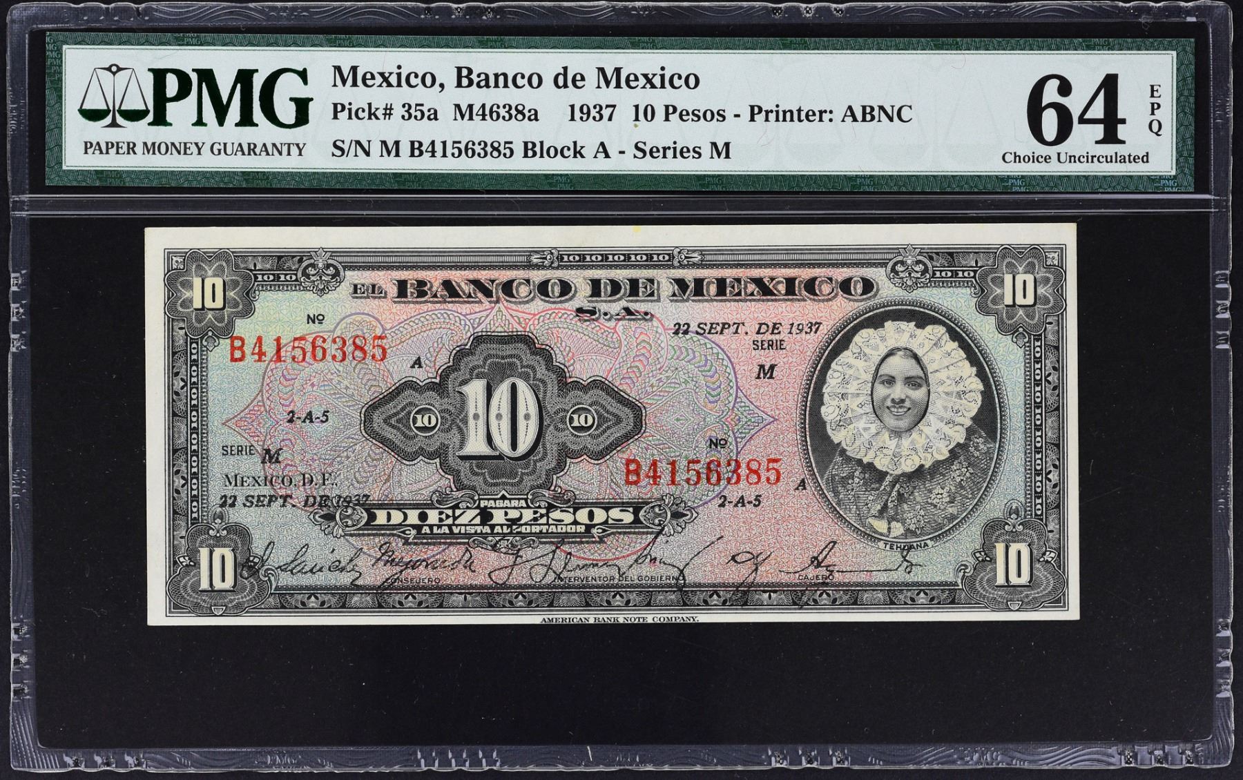 23 pieces in lot. A comprehensive lot of these ABN produced small-size 10 Pesos notes with the important 1936 and 1937 dated notes graded by PMG as Choice Very Fine 35 and Choice Uncirculated 64 EPQ respectively. The others range from Extremely Fine to Gem Uncirculated and most dates and varieties are present.