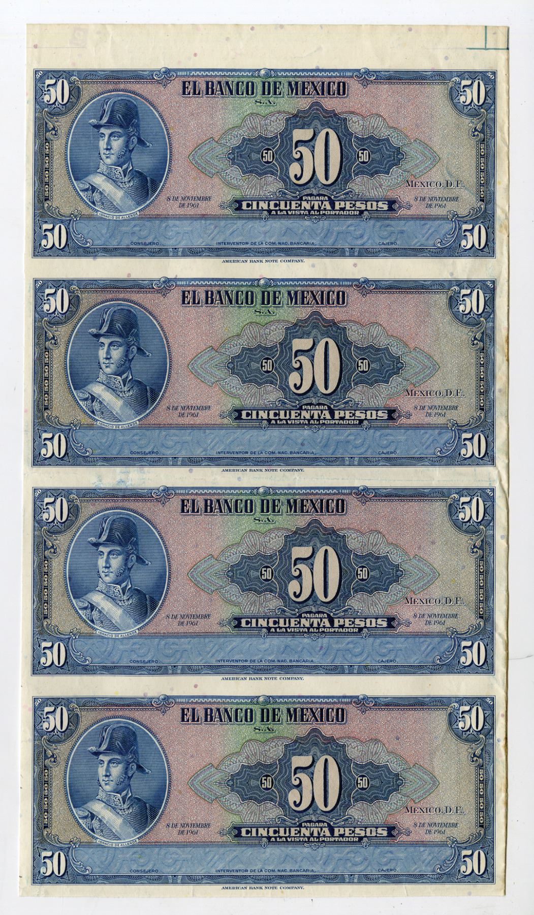 Mexico, 1961. 50 Pesos, P-49p, Uncut Sheet of 4 Progress Proofs, Blue on m/c underprint, Portrait of I. de Allende at left, Back is blank except for 2 red bank stamps at top right and bottom left corners, Sheet is in XF-AU condition, ABNC.