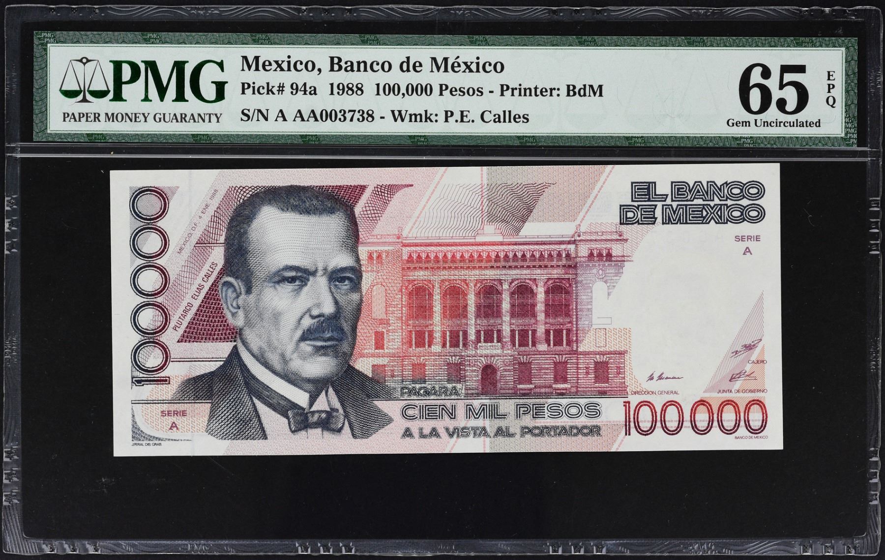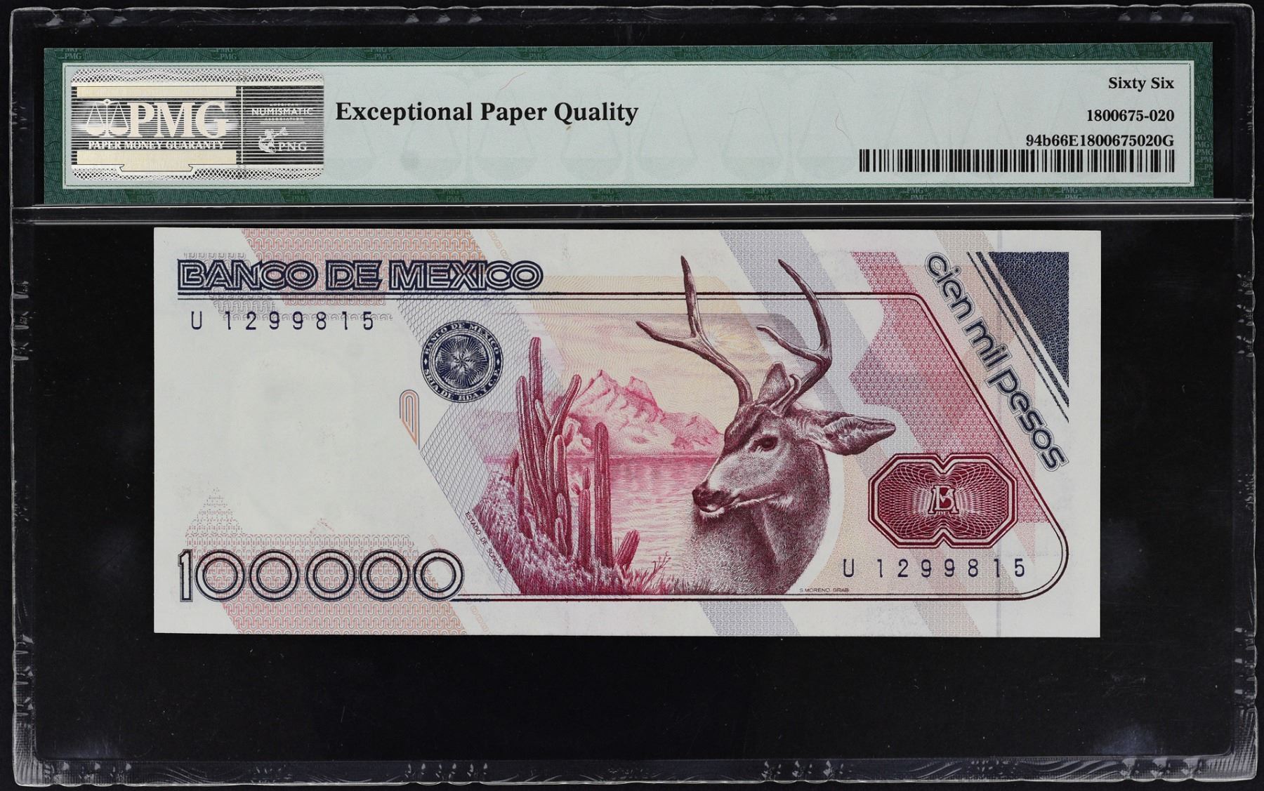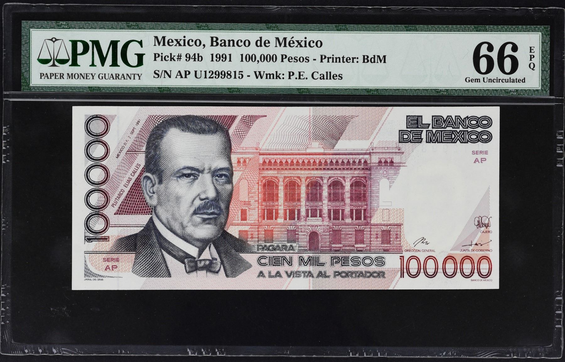 16 pieces in lot. A nice transition grouping with the higher denominations for the Old Pesos seen and the first series of New Pesos. Exceptional date and color variety are observed. Included are the following; 20,000 Pesos(x5); 50,000 Pesos(x5); P-94a in PMG Gem Uncirculated 65 EPQ; P-94b in PMG Gem Uncirculated 66 EPQ; 1992 10, 20, 50 and 100 Pesos.