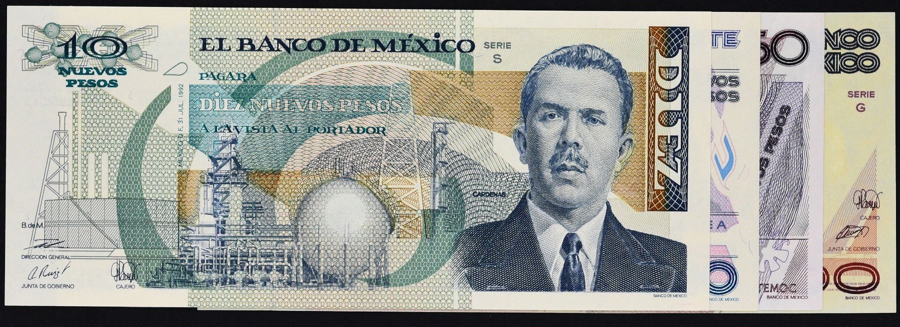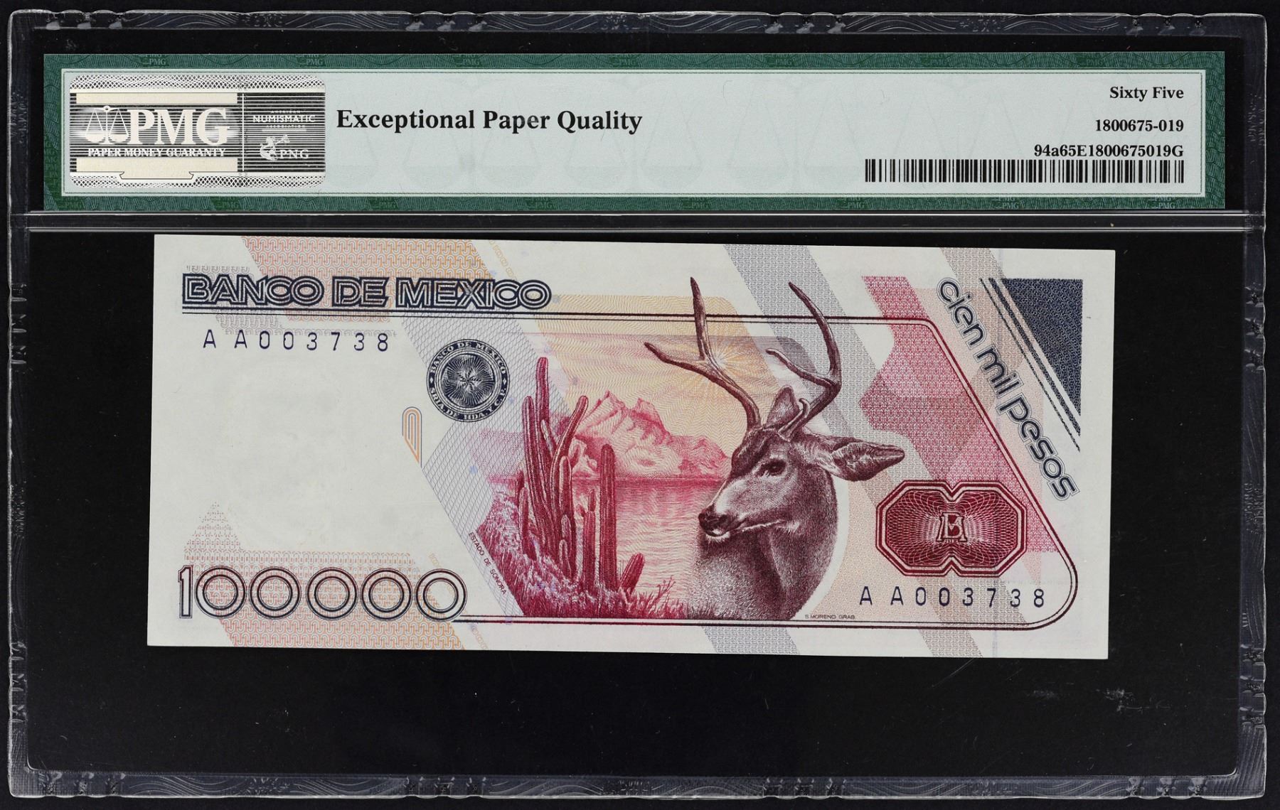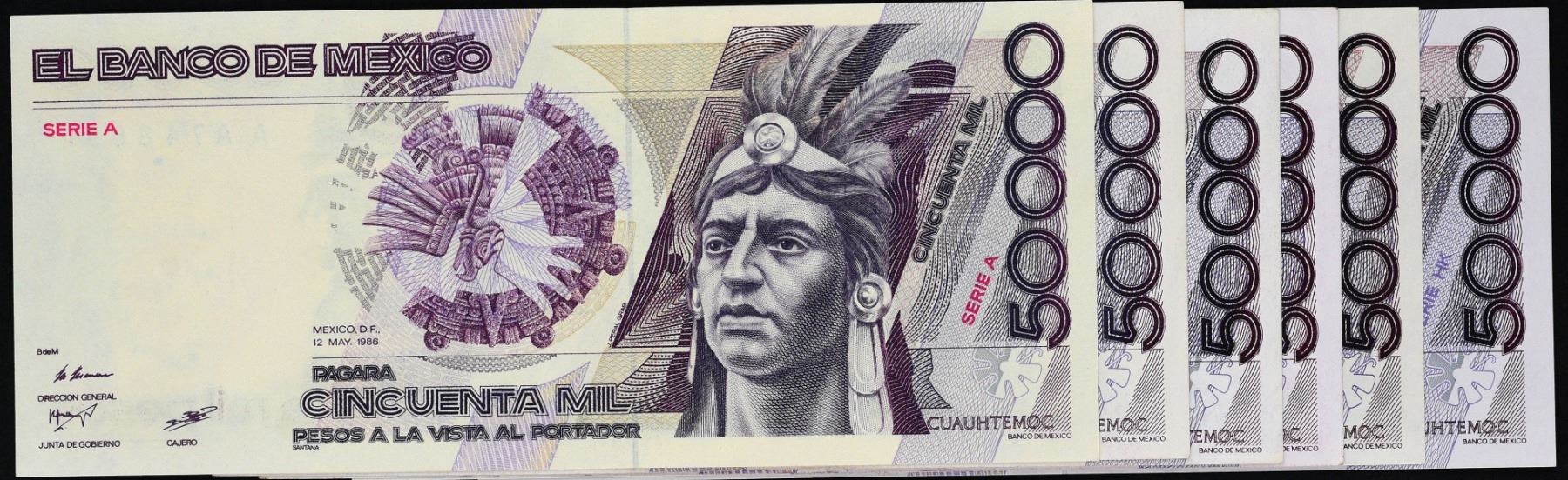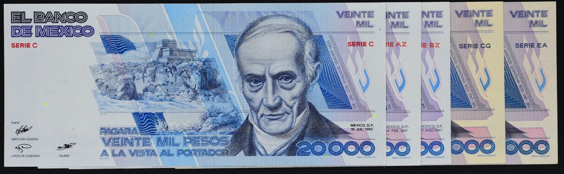 16 pieces in lot. A nice transition grouping with the higher denominations for the Old Pesos seen and the first series of New Pesos. Exceptional date and color variety are observed. Included are the following; 20,000 Pesos(x5); 50,000 Pesos(x5); P-94a in PMG Gem Uncirculated 65 EPQ; P-94b in PMG Gem Uncirculated 66 EPQ; 1992 10, 20, 50 and 100 Pesos.