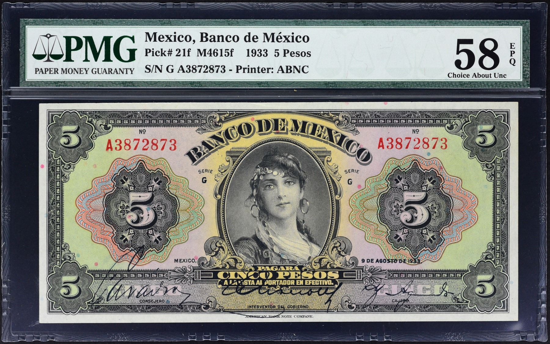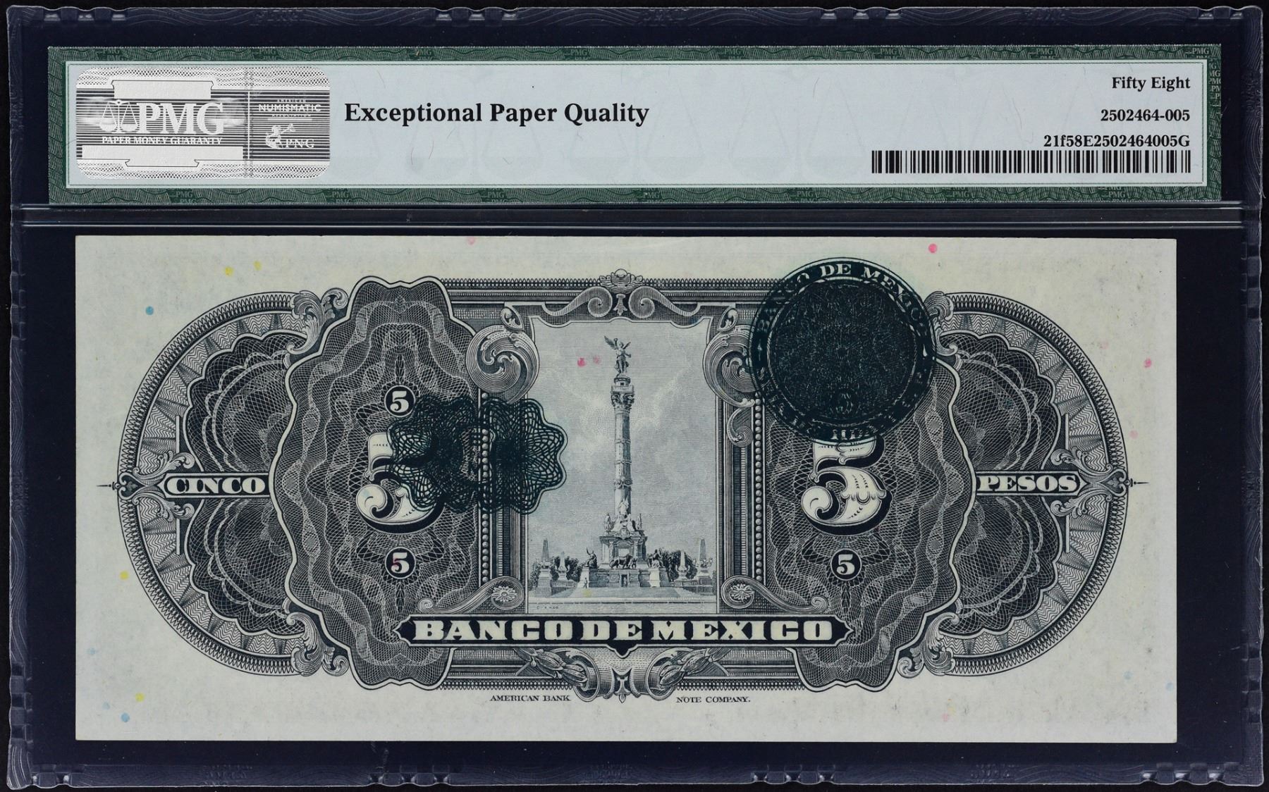 Serie G. An excellent example of this beautifully designed Five Pesos note with just a hint of circulation and fully original paper. Scarce this pleasing.