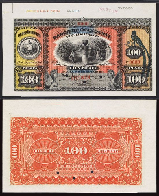 Quetzaltenango, Guatemala, 1st August, 1916, 100 Pesos, P-S182s, Specimen, Black on red, blue and m/c with women harvesting coffee beans in middle, Angels on lower left and right middle, Arms on left and quetzal bird on right, back orange-red, Specimen overprints, POC's, top excess margin with order numbers and overprints, PMG graded Gem Uncirculated 66 EPQ (Exceptional Paper Quality). Extremely colorful and attractive banknote that is extremely rare in this high condition due to the notes large size. ABNC.