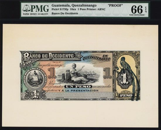 Quetzaltenango, Guatemala, ND (ca.1880's), 1 Peso, P-S173p, Black on green, red, blue, brown and m/c with reclining allegorical women with sailing ships behind her, quetzal bird on right, No back, PMG graded Gem Uncirculated 66 EPQ (Exceptional Paper Quality). Extremely colorful and attractive banknote that is rare in high grade. ABNC.