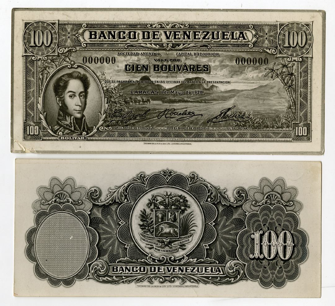 Banco de Venezuela, 1928, TDLR 100 Bolivares Essay Obverse and Reverse Photo Proofs