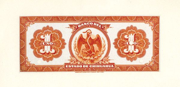 Mexico. Chihuahua. 1913. P-S131Cp. 1 Peso. Reverse proof on large card stock. Rare and unissued UNC piece. ABNC.
