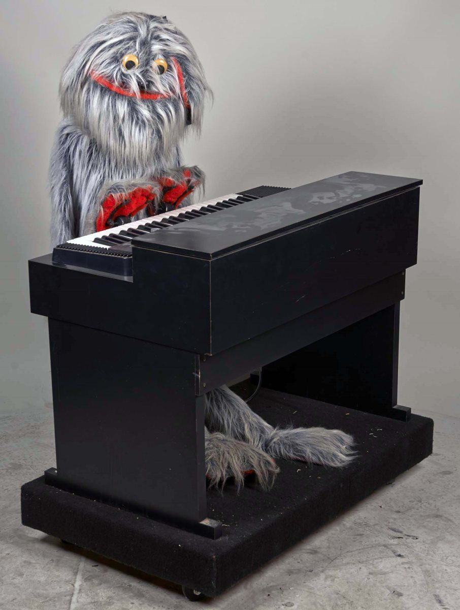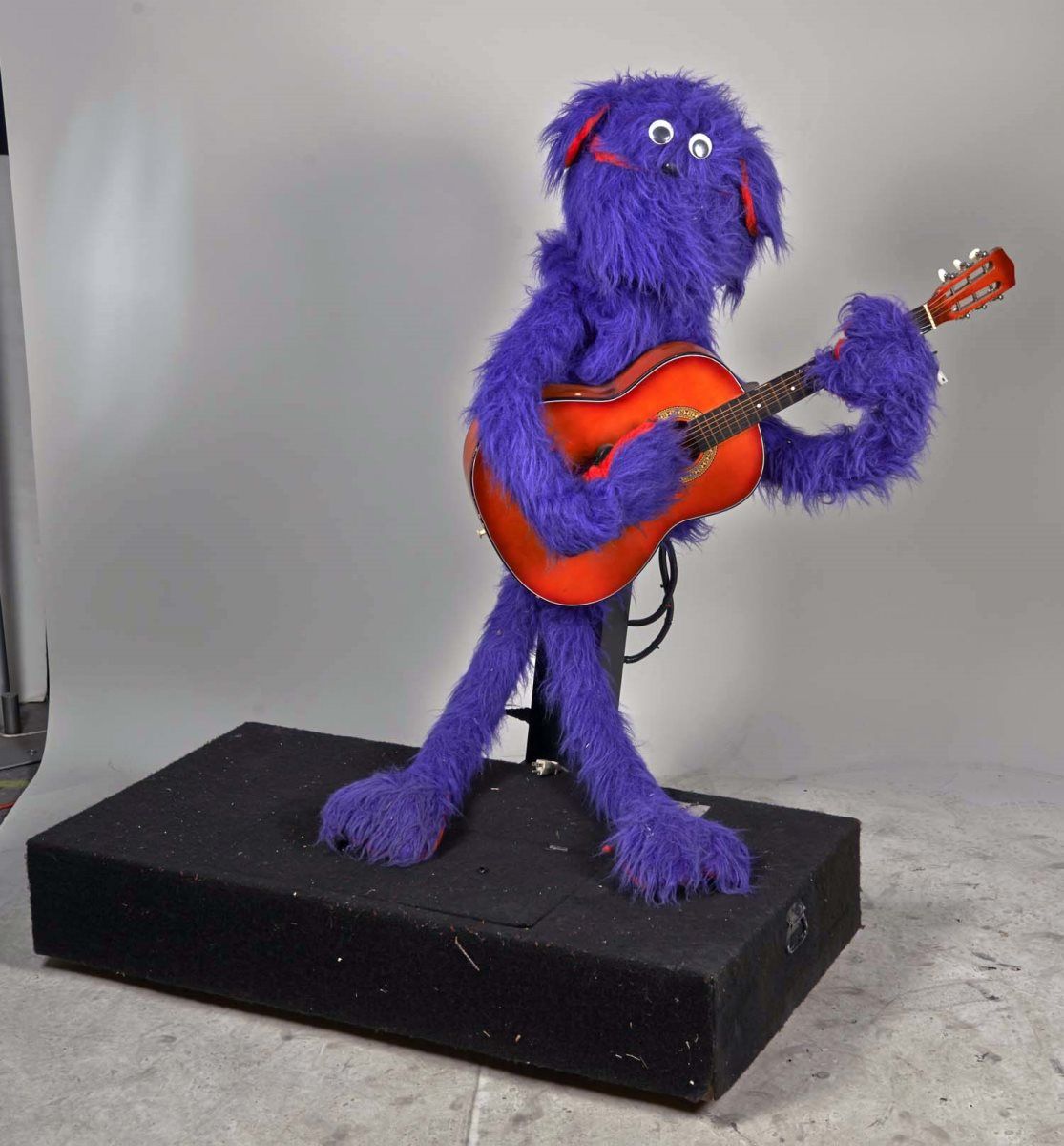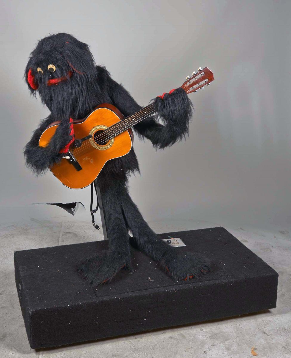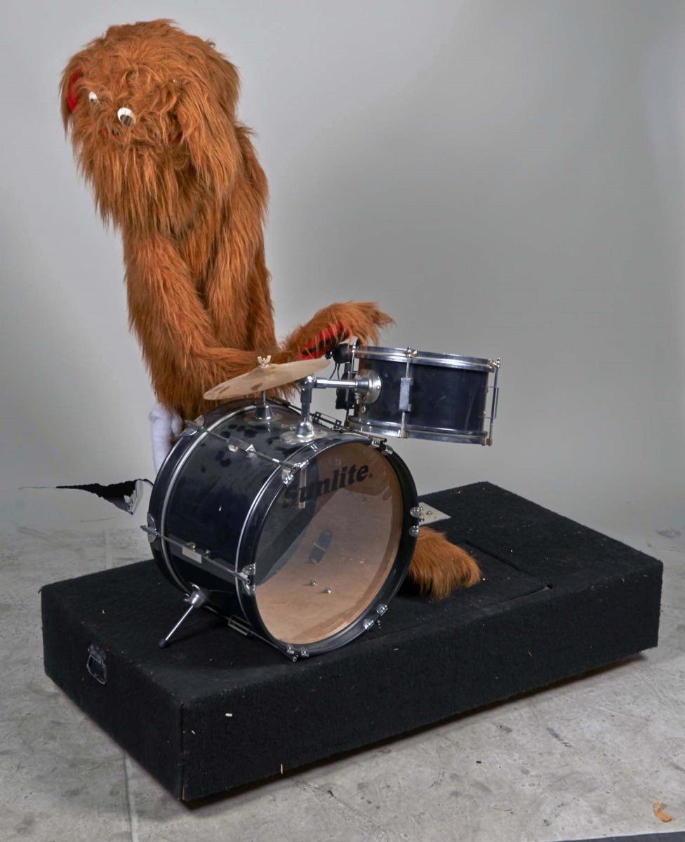 Chirpie (Chirpy) Robot Band from Robot Country USA Inc. All on rolling felt bases, grey Chirpie keyboard player, purple grape juice acoustic guitar player, brown Rusty drummer playing Sunlite drum set, and black furred guitar player. Condition (Very Good)