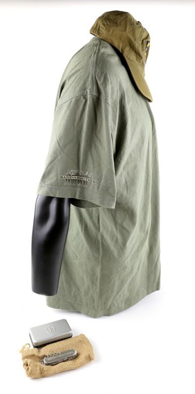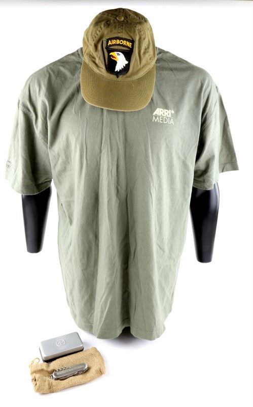 Band of Brothers (2001) American TV series, Cast and Crew gifts including windproof jacket (XXL), Crew T Shirt (XL), Airborne Cap and presentation Wenger Swiss Army Knife in case (4).Provenance: Consigned by John New who worked in the Art Department in over 180 films. He was Assistant Construction Coordinator on Band of Brothers.