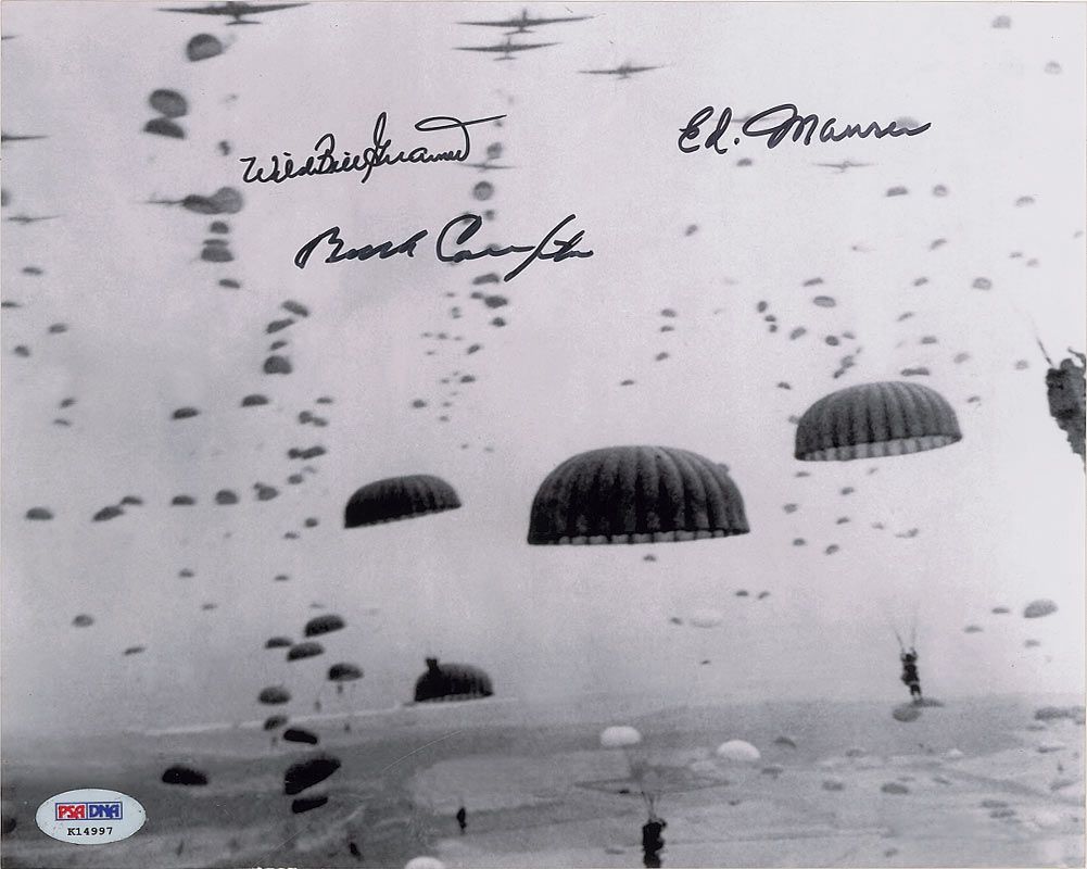 Satin-finish 10 x 8 photo of the 101st Airborne parachuting, signed in black felt tip by Buck Compton, Ed Mause, and ‘Wild Bill’ Guarnere. In fine condition. Accompanied by a certificate of authenticity from PSA/DNA.