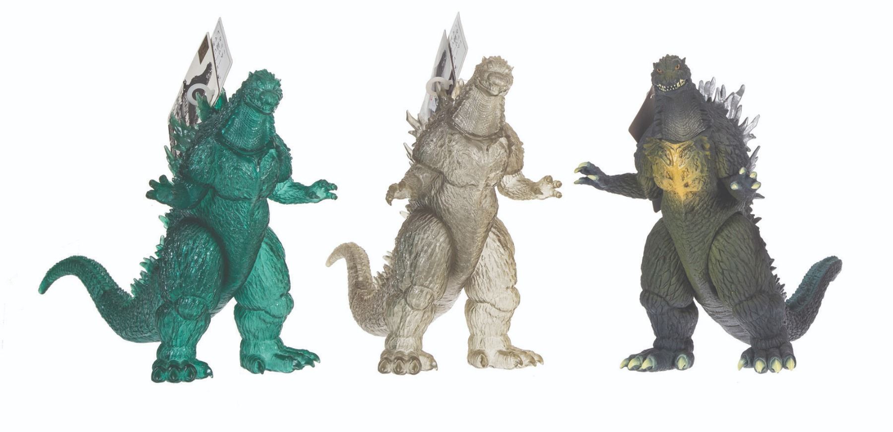 2003. Godzilla 2003 Bandai Vinyl Figure Lot of 3 w/ tags: Theatre Version/Clear Gray Itoyokado Store Exclusive/Clear Green HMV Exclusive. 8. 5” tall figures. VG+.