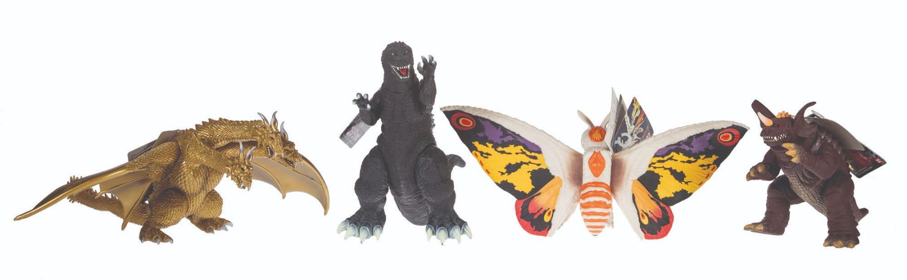 2001. GMK Bandai Vinyl Figure 4 Figure Lot w/ tags. 8. 5” tall Godzilla. VG+.