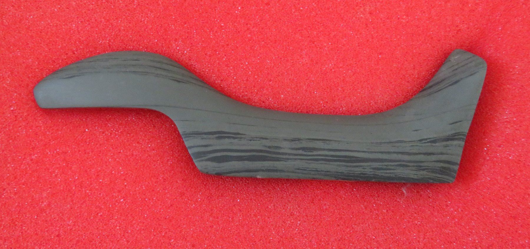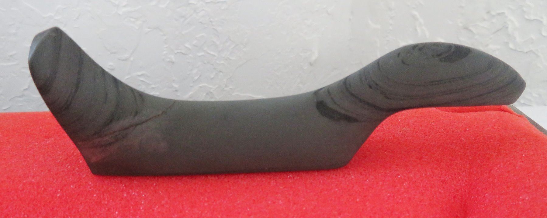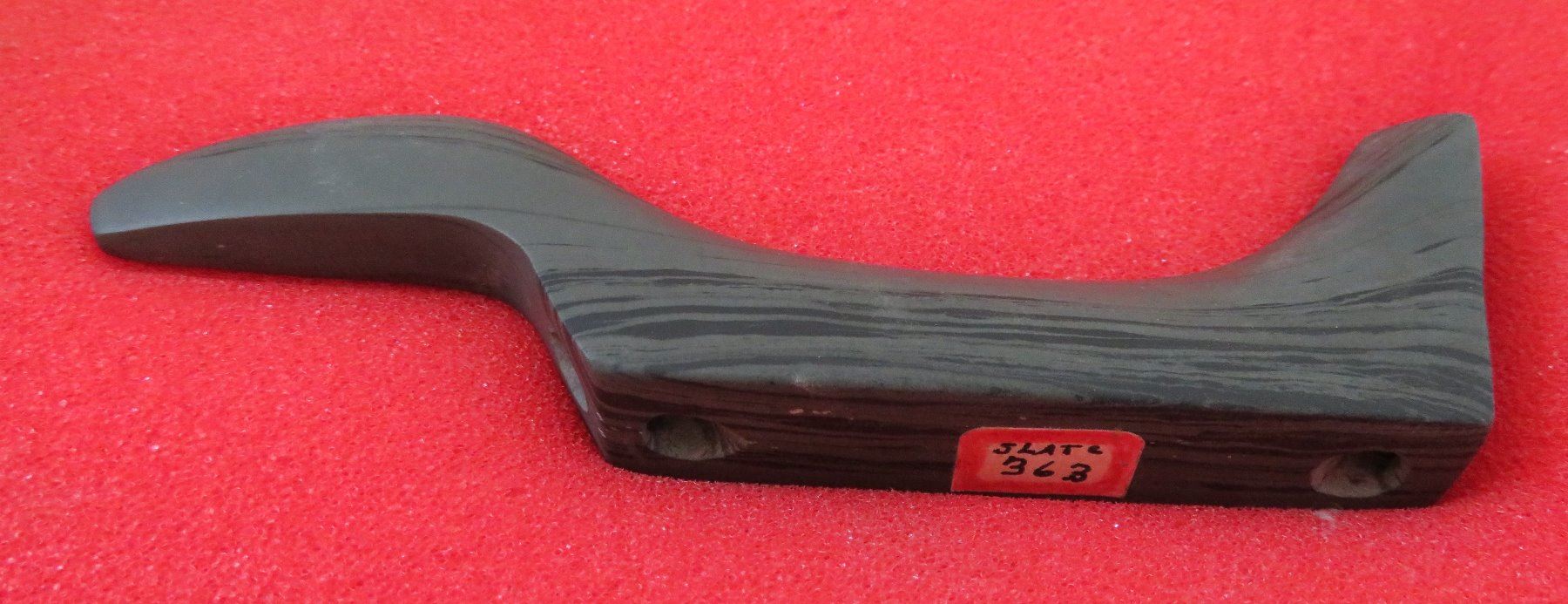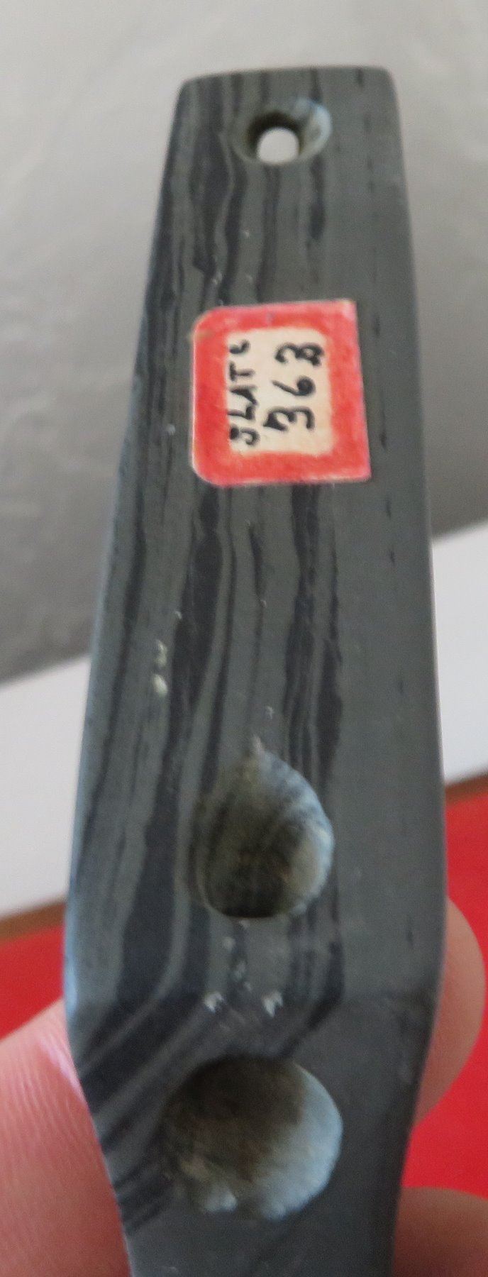 Banded Slate Birdstone, pre-historic item. Made of slate, the item measures 5 1/2" x 1 1/2" x 1". Clinton County, Ohio. Frame not included. Condition: Crack in tail, see images. Shipping: $24.50 w/insurance and signature.