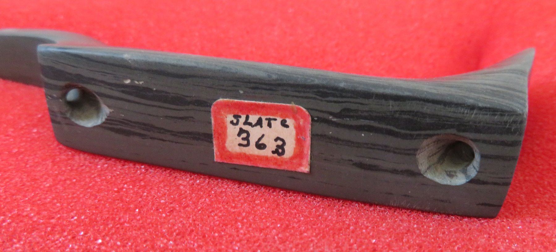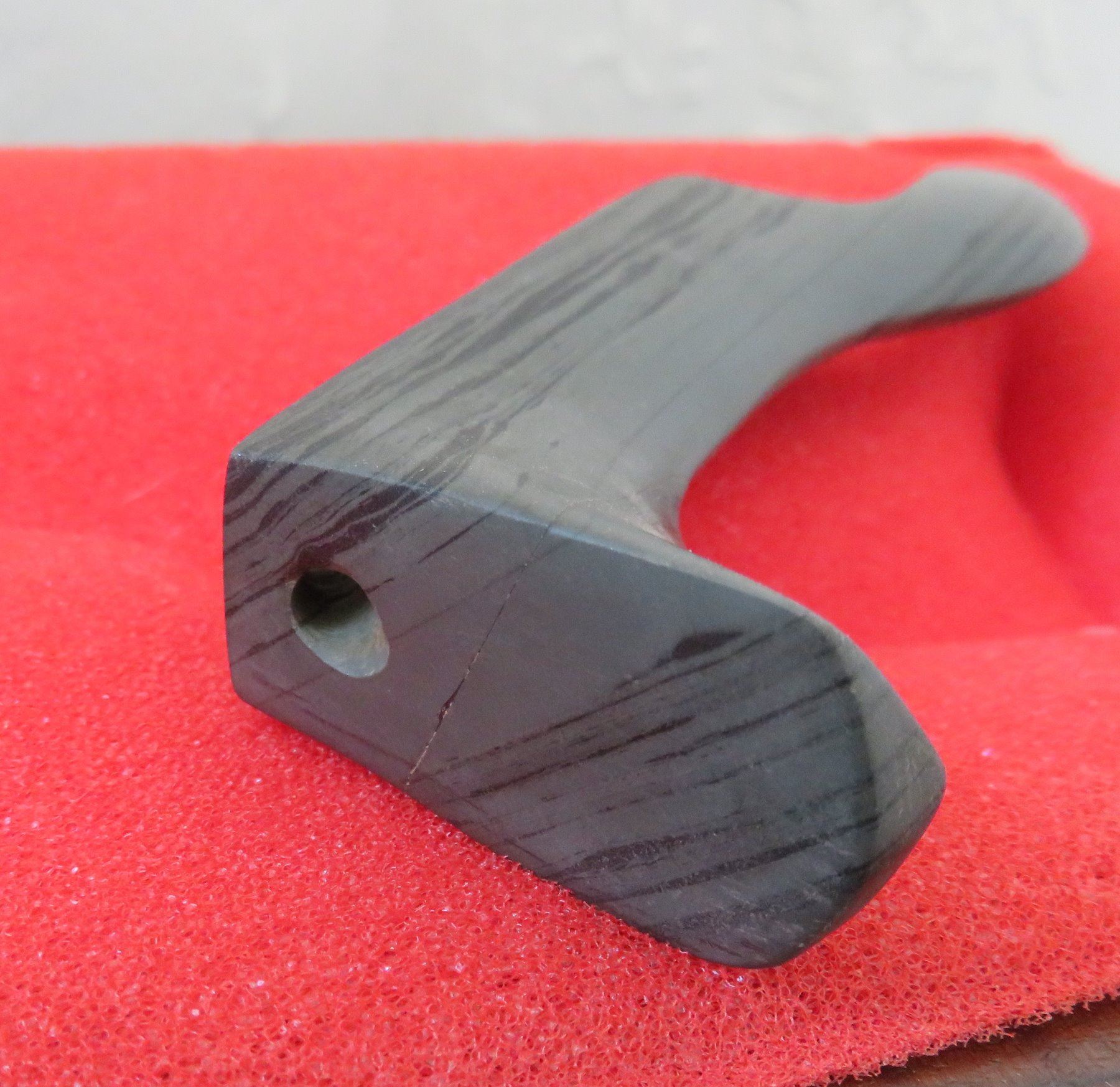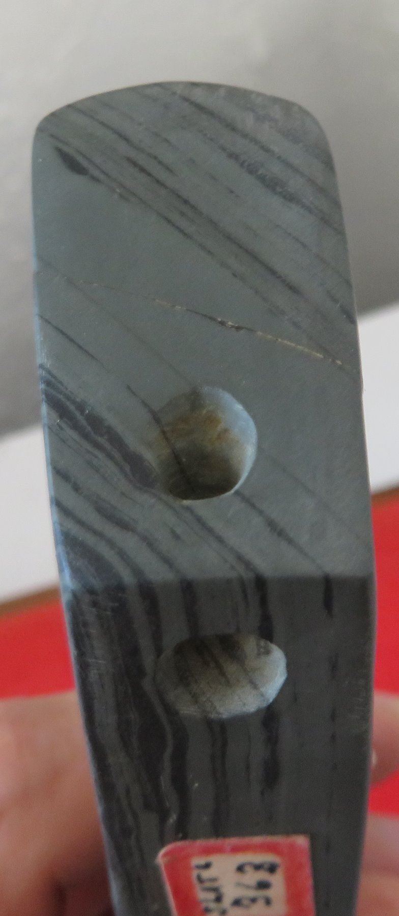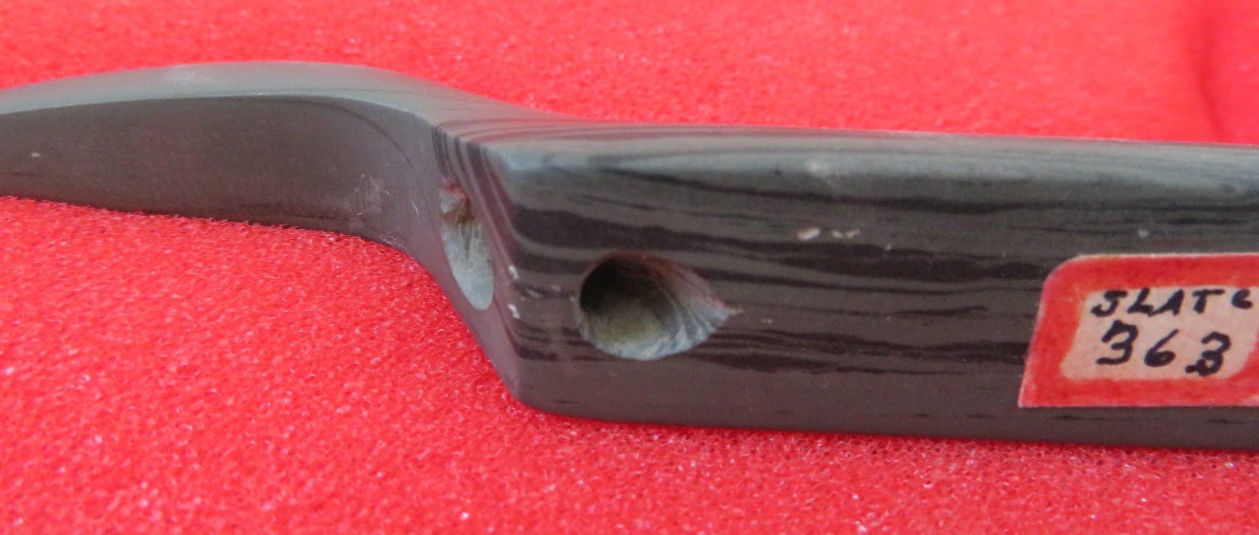 Banded Slate Birdstone, pre-historic item. Made of slate, the item measures 5 1/2" x 1 1/2" x 1". Clinton County, Ohio. Frame not included. Condition: Crack in tail, see images. Shipping: $24.50 w/insurance and signature.