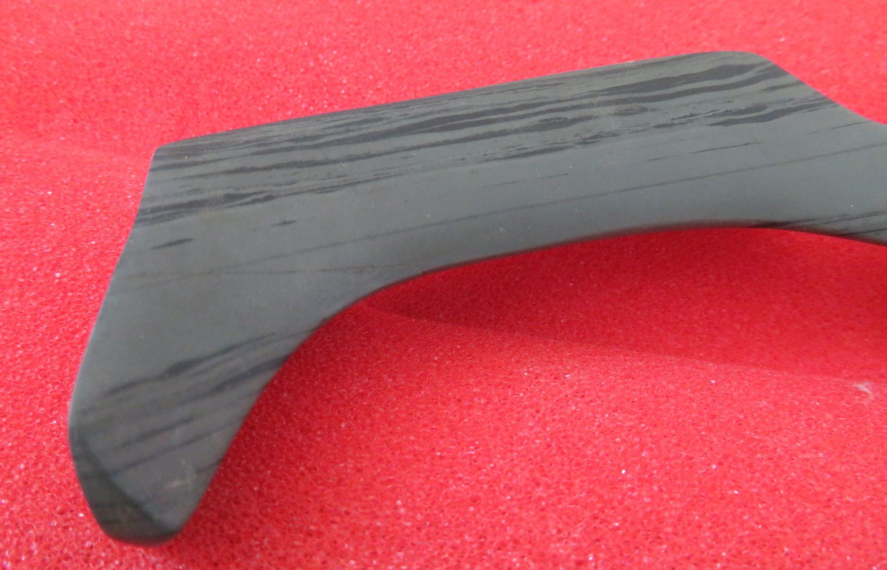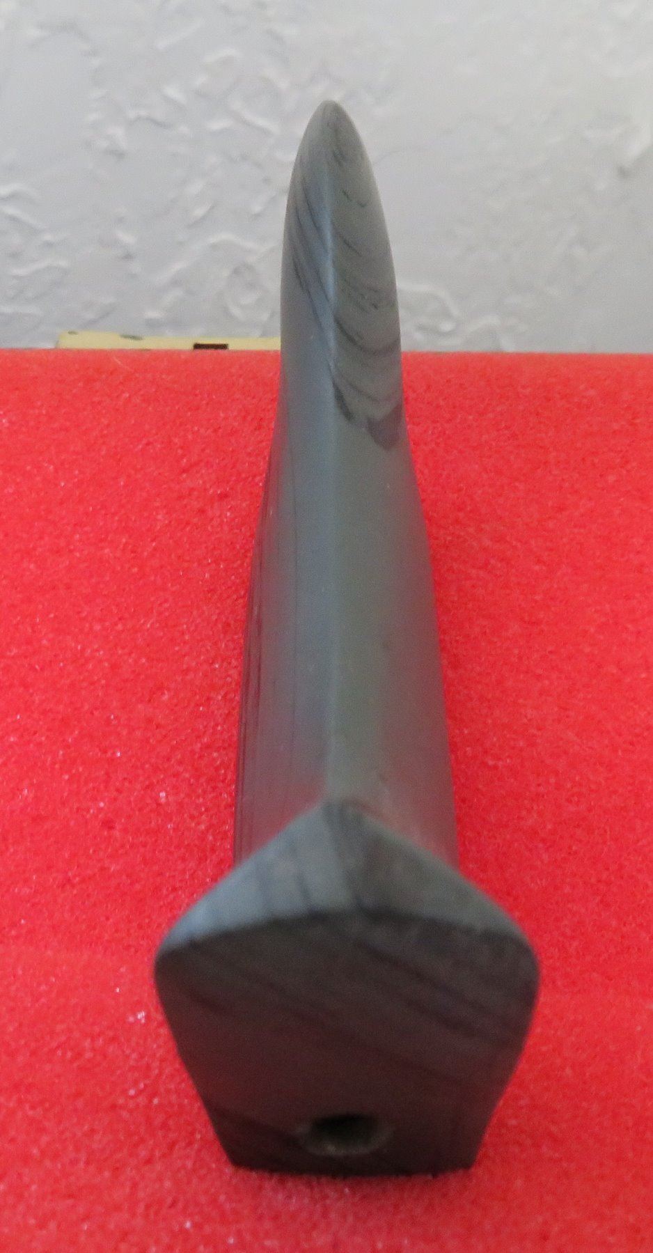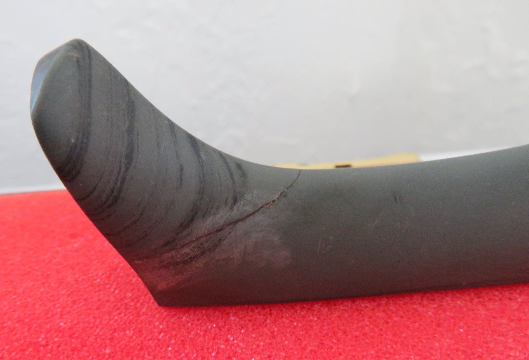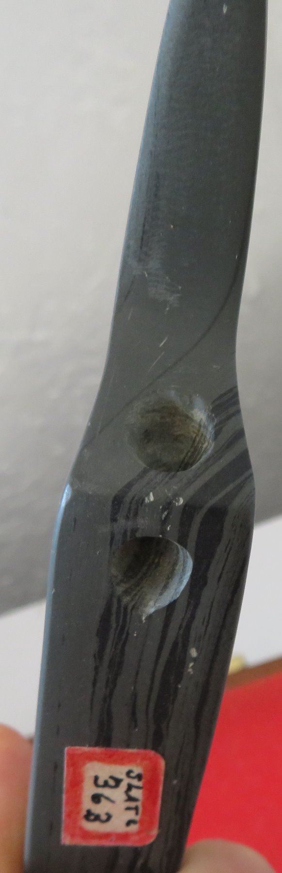 Banded Slate Birdstone, pre-historic item. Made of slate, the item measures 5 1/2" x 1 1/2" x 1". Clinton County, Ohio. Frame not included. Condition: Crack in tail, see images. Shipping: $24.50 w/insurance and signature.