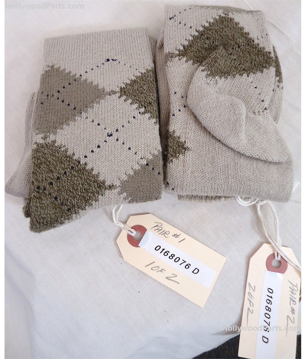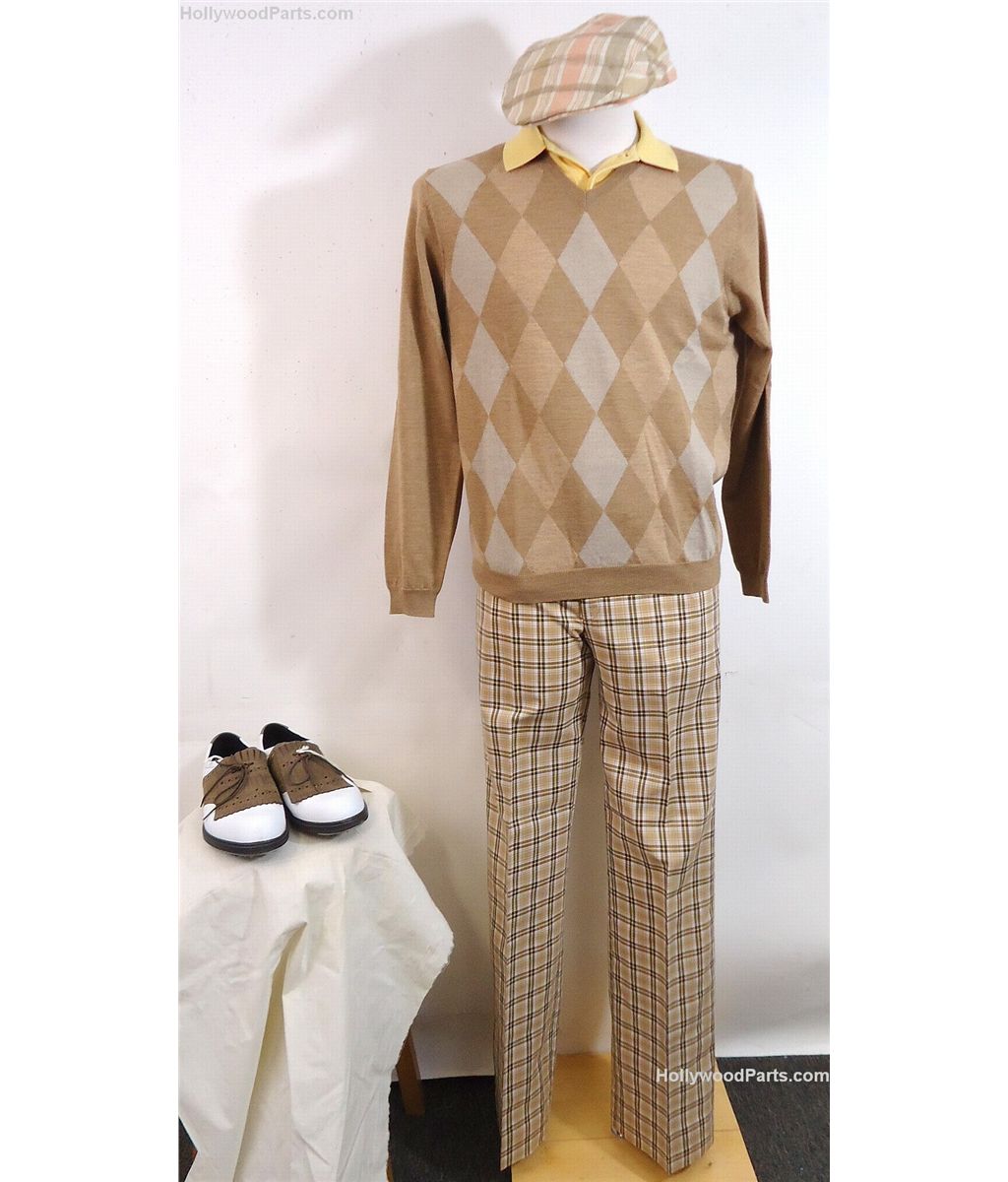 Hero outfit worn by Billy Bob Thornton as Terry Lee Collins in Bandits. Costume consists of Brooks Brothers light tan wool long sleeve sweater with argyle pattern, matching tan plaid hat, tan and brown stripe plaid golf pants, pair of white and brown leather detail shoes, argyle pattern socks and yellow polo style shirt. Change #4, Scenes 24-27. Used at safehouse, Harvey's house and in Suburban.