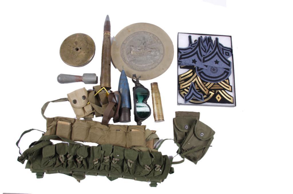 Lot also includes a 2.75in dummy warhead, an anti-personnel bomb, a 4Lot consists of: 5 canvas ammo pouches, both foreign and domestic, 4 ammo bandoleers, 2 for the M1 Garand including clips, and 2 canvas straps. Lot also includes a 2.75in dummy warhead, ananti-personnel bomb, a 40mm Mark 1 dummy cartridge, a .37mm empty case, the base for a 6" Navy round, and a display case of military chevrons and other cloth ensignias. Also a brass plate commemorating "The Construction Committee Inchon Landing Operation Memorial Monument"